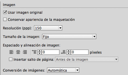 3) Opciones de exportación de imágenes más clara: algo que históricamente sacaba un pelín de quicio a los diseñadores de libros EPUB con InDesign era la sensación de incertidumbre a la hora de conocer qué sucedía con las imágenes. Aún cuando no se marcara la opción «Conservar la apariencia de las imágenes» (en el caso de que estuvieramos seguros si convenía marcarla o no, claro está!) estaba la casilla de cambio de resolución de las imágenes a 96, 150, 300 ppi… de modo que no estábamos seguros si InDesign había respetado el tamaño y resolución originales de nuestras imágenes, las había convertido a PNGs, si lo había hecho con objetos anclados o con todo…